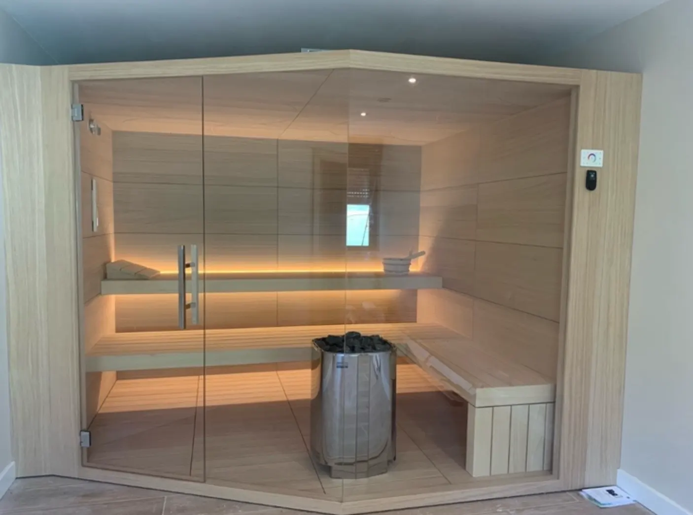 En collaboration avec notre électricien domoticien, nous avons intégré un système domotique complet permettant la gestion intelligente des différentes zones de la villa : éclairage, chauffage, sécurité et ambiance. Nous avons également conçu un espace spa privé, comprenant un sauna sur-mesure dessiné par notre agence, dans une ambiance chaleureuse inspirée d'un chalet haut de gamme.